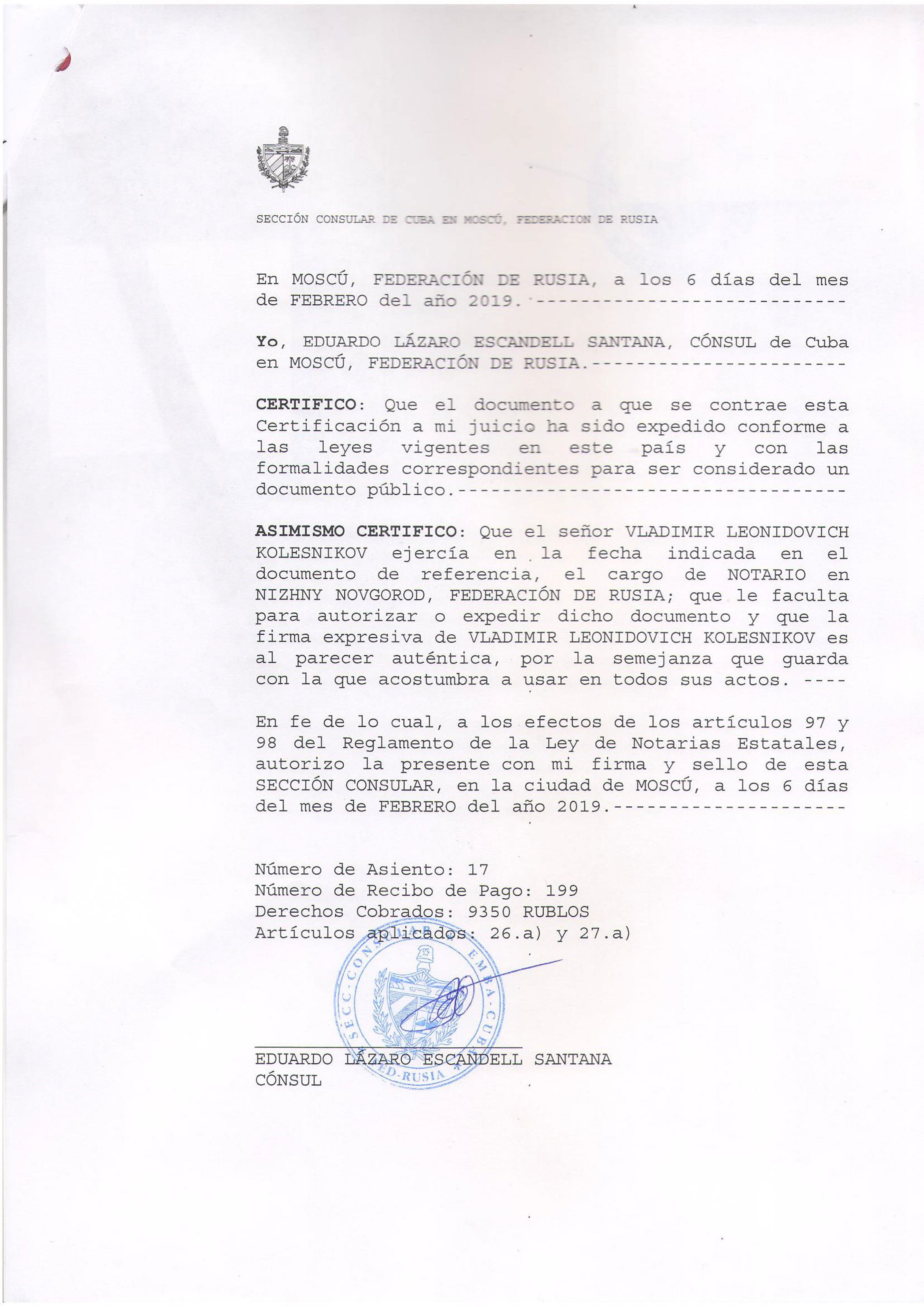 Соответственно, обычная для консульской легализации цепочка действий (нотариальная копия с документа – нотариальный перевод на испанский – проставление отметки Минюста – проставление отметки МИДа – проставление отметки посольства страны назначения) не требуется! Если же ваши партнеры в Кубе настаивают на консульской легализации документа или вам кажется, что нотариально заверенный перевод выглядит недостаточно солидно, то можно поступить следующим образом:
