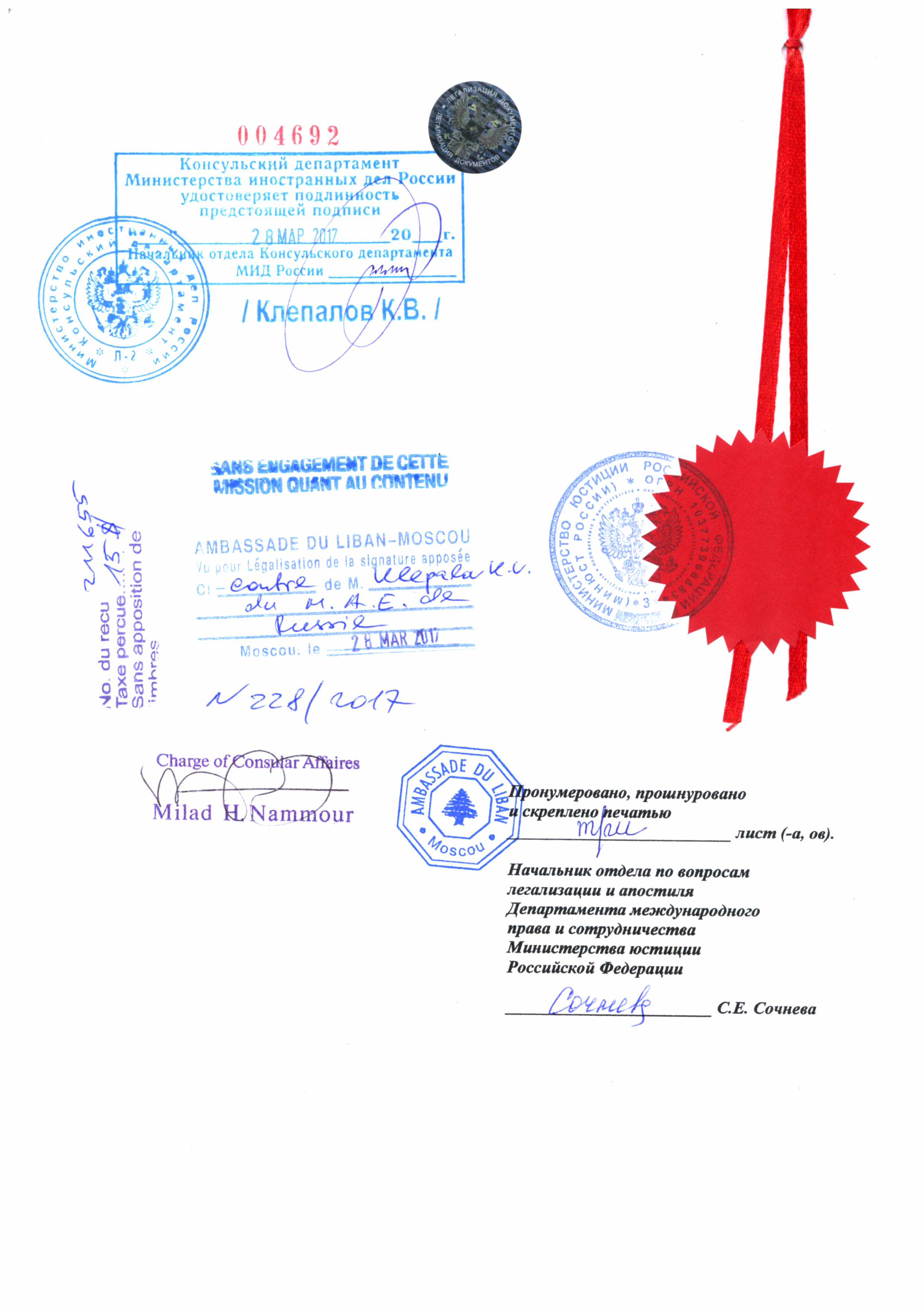 - далее нужно осуществить перевод с русского на английский или французский язык (обязательно уточняйте этот вопрос с вашими ливанскими партнерами или по месту предоставления документов в Ливане).